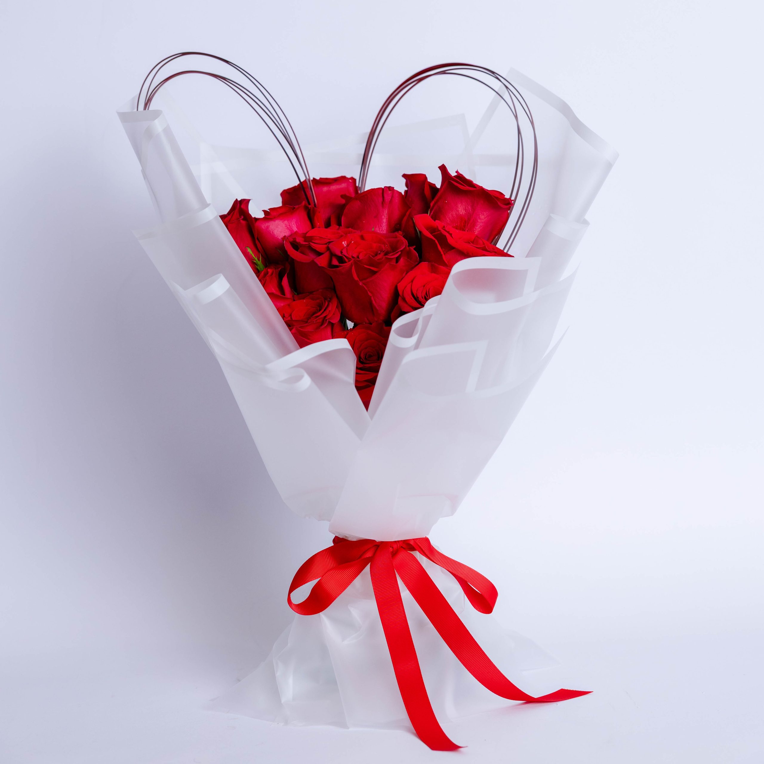 باقة أنيقة من زهور الجوري الحمراء بتصميم على شكل قلب، تعبر عن أعمق مشاعر الحب والرومانسية. مغلفة بعناية مع لمسة راقية تجعلها الهدية المثالية ليوم الحب.